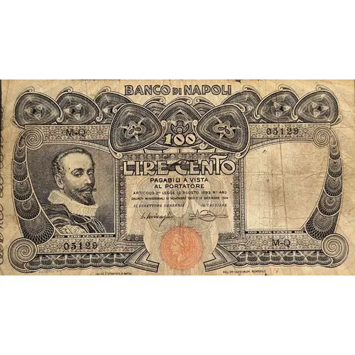 | Obverse lettering | BANCO DI NAPOLI 100 LIRE CENTO PAGABILI A VISTA AL PORTATORE |