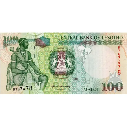 | Opis líce | CENTRAL BANK OF LESOTHO THIS NOTE IS LEGAL TENDER FOR ONE HUNDRED MALOTI ONE HUNDRED MALOTI |
