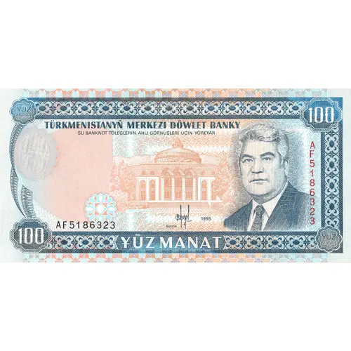 | Obverse lettering | TÜRKMENISTANYÑ MERKEZI DÖWLET BANKY $U BANKNOT TÖLEGLERIÑ ÄHLI GÖRNÜ$LERI ÜÇIN ҰÖREҰÄR ҰÜZ MANAT (Translation: Central State Bank of Turkmenistan, This banknote is valid for all types of payments, One Hundred Manat) |
