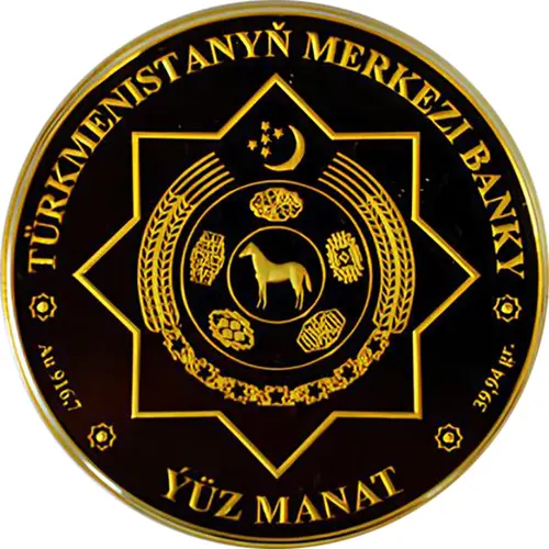 | Obverse lettering | * TÜRKMENISTANYÑ MERKEZI BANKY * Au 916,7 * ÝÜZ MANAT * 39,94 gr. (Translation: Turkmenistan Central Bank A hondred manat) |