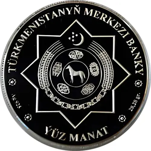 | Legenda do anverso | * TÜRKMENISTANYÑ MERKEZI BANKY * Ag 925* ÝÜZ MANAT * 28,28 gr. (Translation: Turkmenistan Central Bank A hondred manat) |