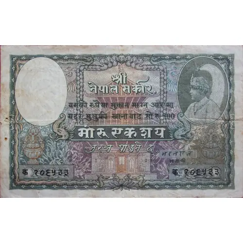 | Opis awersu | Watermark Window - watermark of King Tribhuwan, Kalash - a Holy Vase (L.), Pashupatinath Temple (C.), Portrait ok King Tribhuwan in Plumed Crown, Kalash (R.) |