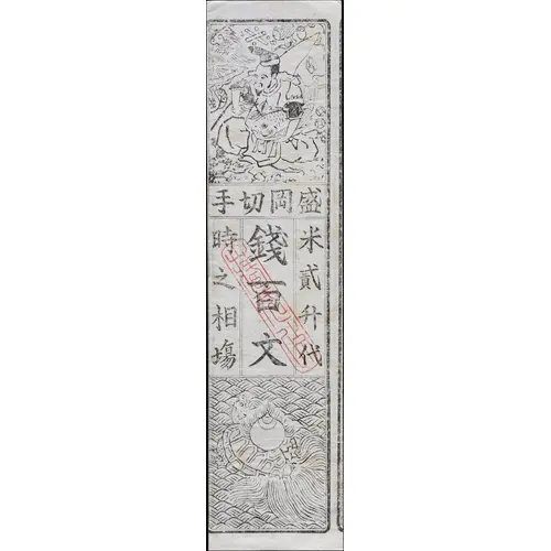 | Descrizione del rovescio | Black print; green stamp. Inscriptions in Fundō shaped cartouche, cloud background outside, on top. Two square seals with seal script inside, in the upper center. Vertical inscription in Chinese regular script at bottom. |