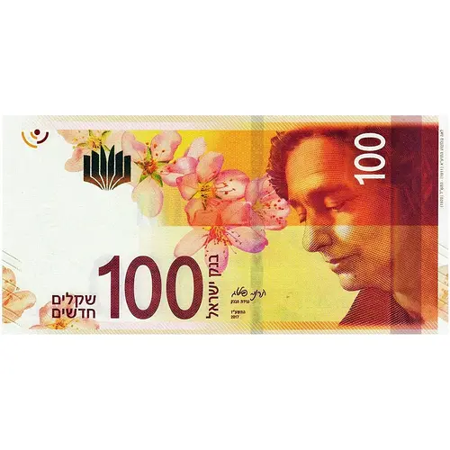 | 裏面の銘文 | 100 بنك إسرائيل شيكل إسرائيلي BANK OF ISRAEL 100 NEW SHEKELS יָמִים לְבָנִים, אֲרֻכִּים כְּמוֹ בַּקַּיִץ קַרְנֵי־הַחַמָּה (Translation: White days, as long as in summer the rays of heat) |