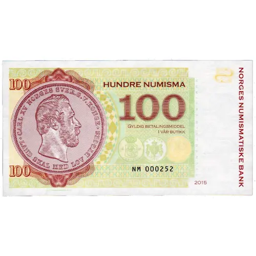 | Vorderseitenlegende | HUNDRE NUMISMA 100 GYLDIG BETALINGSMIDDEL I VÅR BUTIKK 2015 |