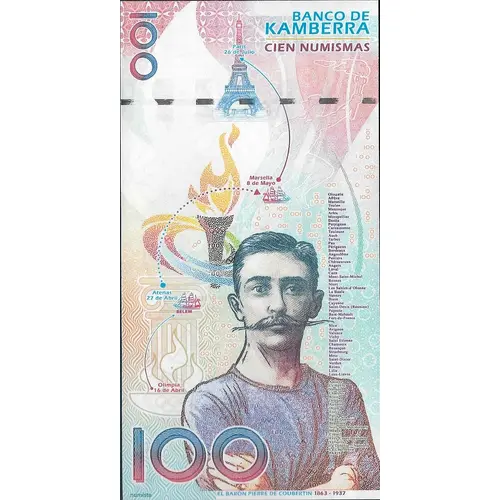 100 BANCO DE KAMBERRA CIEN NUMISMAS Paris 26 de Julio Marsella 8 de Mayo Atena 27 de Abril BELEM OIimpia 16 de Abril 100 EL BARON PIERRE DE COUBERTIN 1863 - 1937 |