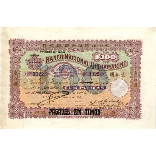 | Ön yüz açıklaması | Bank Note from Macau , counterstamped in 1945: -Printed stamp `PAGAVEL EM TIMOR` |