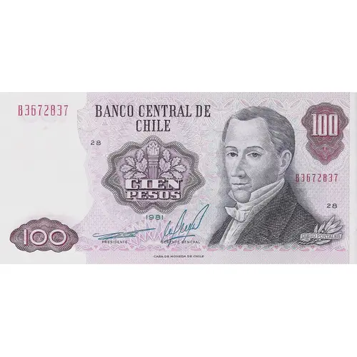 | Légende de l’avers | BANCO CENTRAL DE CHILE CIEN PESOS 1981 CASA DE MONEDA DE CHILE (Translation: Central Bank of Chile One Hundred Pesos Chile Mint) |