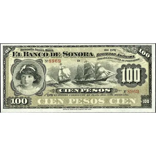 | 正面铭文 | Hermosillo, Sonora, Mexico EL BANCO DE SONORA SOCIEDAD ANÓNIMA PAGARÁ Á LA VISTA AL PORTADOR CIEN PESOS EN MONEDA CORRIENTE DE PLATO DEL CUÑO MEXICANO. (Translation: The Bank of Sonora Anonymous Society Will pay on sight to the bearer One Hundred Pesos in current silver coin of Mexican making.) |