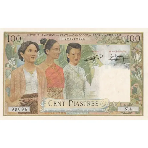 | Legenda awersu | 100 INSTITUT D’ÉMISSION DES ETATS DU CAMBODGE, DU LAOS ET DU VIET-NAM 100 CENT PIASTRES |