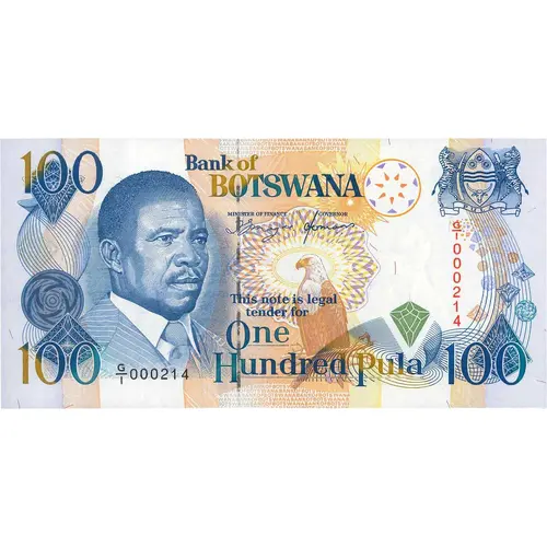 BANK OF BOTSWANA THIS NOTE IS LEGAL TENDER FOR ONE HUNDRED PULA |