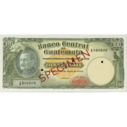 | Opis líce | Banco Central DE Guatemala PAGARA AL PORTADOR Á LA VISTA, EN EFECTIVO Y Á LA PAR CIEN QUETZALES GUATEMALA, 7 de Julio de 1926. SPECIMEN (Translation: Central Bank of Guatemala Pay the bearer in cash at sight and at par One Hundred Quetzals Guatemala, June 7th., 1926.) |