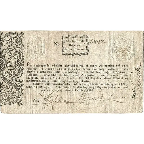 | نوشتههای روی اسکناس | No. 6898 Et Hundrede Rigsdaler dansk Courant Paa forlangende erholder Ihændehaveren af denne Assignation ved Fore- viisning Et Hundrede Rigsdaler dansk Courant, enten ved den Slesvig - Holsteenske Casse i Rendsborg, eller ved den Kongelige Amtstue i Aalborg. Imidlertid validerer denne Assignation, indtil samme vorder indkaldt, imellem Mand og Mand, for 100. Rigsdaler dansk Courant og modtages saaledes i alle Kongelige Oppebörseler. Udstædt i overenstemmelse med den allerhöieste Forordning af 18. Sep tember 1807. og efter Autorisation fra den Kongelige Regjerings Commission. Christiania, den 1. October 1807. |