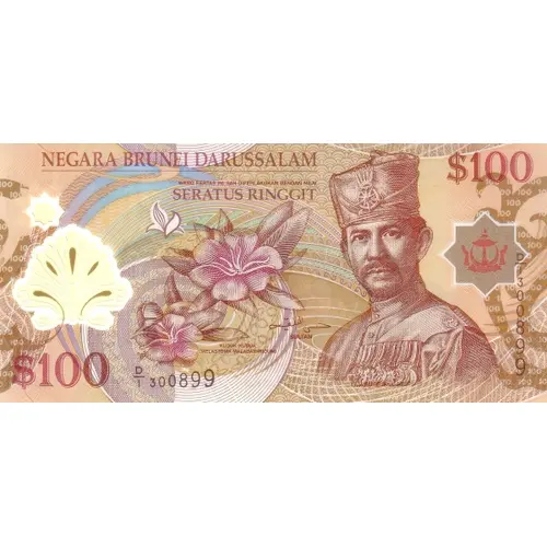 | Legenda do anverso | NEGARA BRUNEI DARUSSALAM WANG KERTAS INI SAH DIPERLAKUKAN DENGAN NILAI SERATUS RINGGIT KUDUK-KUDUK (MELASTOMA MALABATHRICUM) (Translation: State of Brunei Darussalam, This note is valid with the value of One Hundred Dollars) |