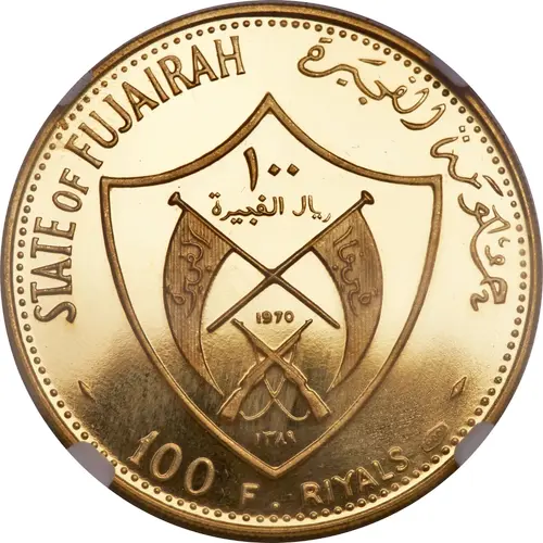 | Averslegende | STATE OF FUJAIRAH حُكومَة الفجَيرة ١٠٠ ريال الفجيرة الفجيرة الفجيرة 1970 ١٣٨٩ - 100 F . RIYALS [900] - (Translation: State of Fujairah 100 Fujairah Riyals Fujairah 1970 1389 100 F. Riyals [900]) |