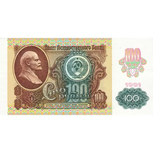 Bust of Vladimir Lenin with colour overprint on the right edge: `100` and `1991` |