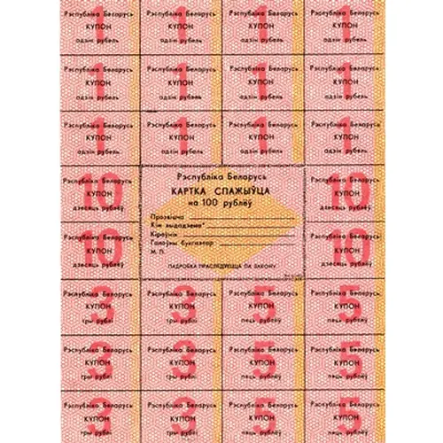 | Ön yüz lejandı | Рэспубліка Беларусь КАРТКА СПАЖЫЎЦА на 100 рублёў Прозвішча __________ Кім выдадзена __________ Кіраўнік __________ Галоўны бухгалтар __________ М. П. ПАДРОБКА ПРАСЛЕДУЕЦЦА ПА ЗАКОНУ (Translation: Republic of Belarus, Consumer card for 100 Rubles, Last name/Issuing authority/Administrator/Chief accountant, Counterfeit is prosecuted by law) |