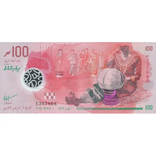 | Arka yüz lejandı | 7 JULY 2024 100 ONE HUNDRED RUFIYAA MALDIVES |