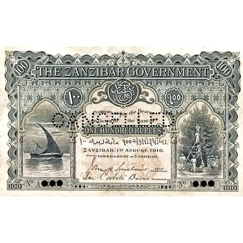 | Opschrift voorzijde | THE ZANZIBAR GOVERNMENT ١٠٠ ૧૦૦ PROMISES TO PAY THE BEARER ON DEMAND THE SUM OF ONE HUNDRED RUPEES مائة روبية ١٠٠ ૧૦૦ એકસો રૂપિયા ZANZIBAR FOR THE GOVERNMENT OF ZANZIBAR (Translation: 100 100 100 one hundred rupees 100 one hundred rupees) |