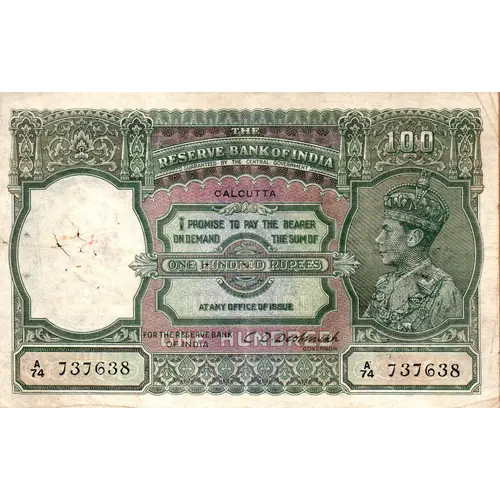 | Legenda do anverso | THE RESERVE BANK OF INDIA GUARANTEED BY THE CENTRAL GOVERNMENT CALCUTTA I PROMISE TO PAY THE BEARER ON DEMANDTHE SUM OF ONE HUNDRED RUPEES AT ANY OFFICE OF ISSUE |