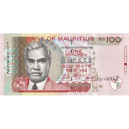 | Obverse lettering | BANK OF MAURITIUS RS 100 THIS NOTE IS LEGAL TENDER FOR ONE HUNDRED RUPEES MR RENGANADEN SEENEEVASSEN 1910-1958 |