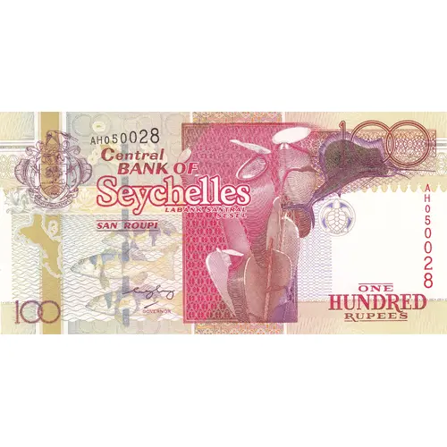 Texte en Anglais et Créole: Central Bank of Seychelles / Labank Santral Sesel one hundred rupees 100 |