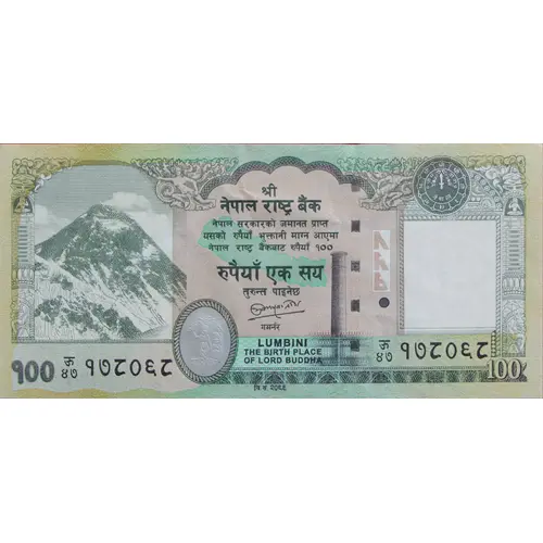 Opis líce श्री नेपाल राष्ट्र बैंक नेपाल सरकारको जमानत प्राप्त यसको रुपैयाँ शुत्त्कनी माग्न आएमा नेपाल राष्ट्र बैंकबाट रुपैयाँ १०० रुपैयाँ पचास तुरुन्त पाइनेछ गभर्नर LUMBINI THE BIRTH PLACE OF LORD BUDDHA १०० 100 [year]