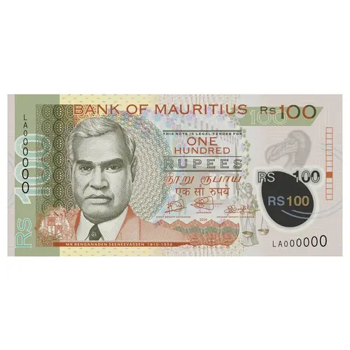 | Описание лицевой стороны | Front: English, Hindi, and Tamil text; coat of arms; Renganaden Seeneevassen; bank building façade; standing Justice with sword and scales; dodo bird head; blue-to-gold Swing dodo egg. |