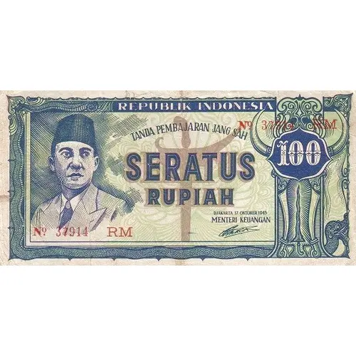 REPUBLIK INDONESIA TANDA PEMBAJARAN JANG SAH SERATUS RUPIAH DJAKARTA 17 OKTOBER 1945 MENTERI KEUANGAN |