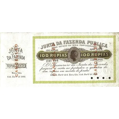 | Legenda awersu | Junta da Fazenda Publica 100 RUPIAS |