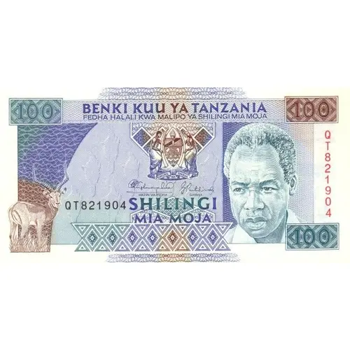 | Obverse lettering | BENKI KUU YA TANZANIA FEDHA HALALI KWA MALIPO YA SHILINGI MIA MOJA UHURU NA UMOJA SHILINGI MIA MOJA 100 (Translation: Central Bank of Tanzania Legal tender for one hundred shillings Freedom and unity One hundred shillings) |