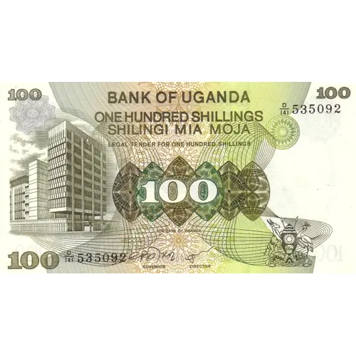 | Obverse lettering | BANK OF UGANDA ONE HUNDRED SHILLINGS SHILINGI MIA MOJA LEGAL TENDER FOR ONE HUNDRED SHILINGS 100 FOR BANK OF UGANDA FOR GOD AND MY COUNTRY (Translation: One hundred shillings) |