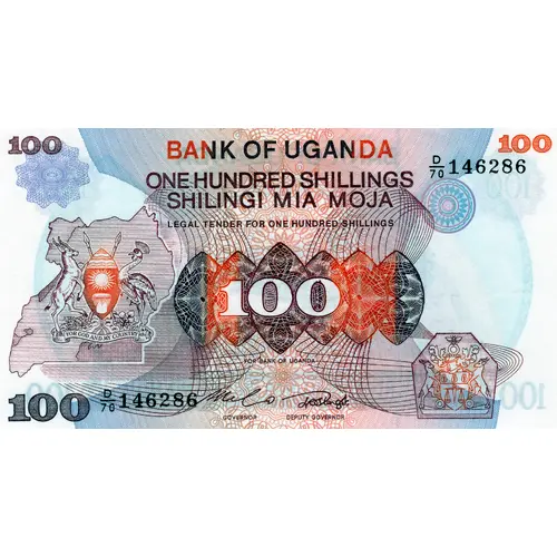 | Leyenda del reverso | BANK OF UGANDA ONE HUNDRED SHILLINGS SHILINGI MIA MOJA 100 (Translation: One hundred shillings) |