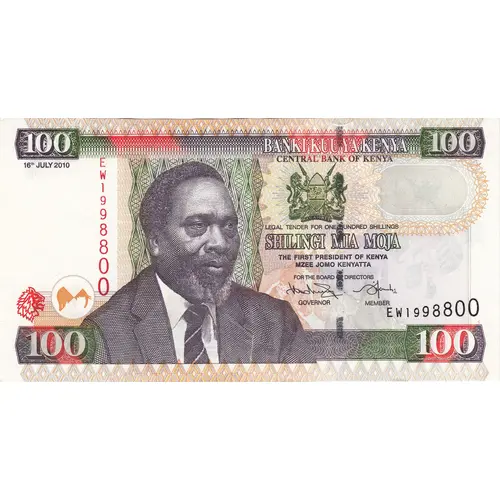 100 BANKI KUU YA KENYA CENTRAL BANK OF KENYA HARAMBE LEGAL TENDER FOR ONE HUNDRED SHILLINGS SHILIGI MIA MOJA THE FIRST PRESIDENT OF KENYA MZEE JOMO KENYATTA FOR THE BOARD OF DIRECTORS (Translation: Central Bank of Kenya All pull together One hundred shillings) |