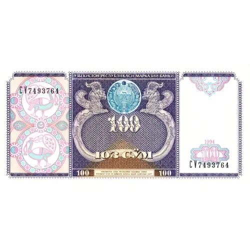 (Translation: Central Bank of the Republic of Uzbekistan, One Hundred So‘m, The Uzbek so‘m must be accepted at face value for all payments in the republic)
