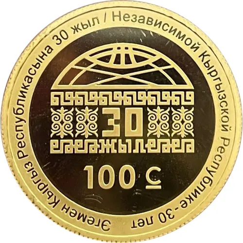 | Opis líce | Эгемен Кыргыз Республикасына 30 жыл / Независимой Кыргызской Републике - 30 лет 30 ЖЫЛ 100 ⃀ (Translation: 30 years of the independent Kyrgyz Republic, 30 years, 100 Som) |