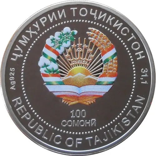 | Chữ khắc mặt trước | ҶУМҲУРИИ ТОҶИКИСТОН REPUBLIC OF TAJIKISTAN Ag 925 31,1 100 СОМОНӢ (Translation: Republic of Tajikistan 100 Somonii) |