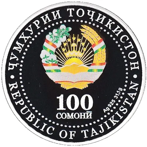 | Legenda del dritto | • ҶУМҲУРИИ ТОҶИКИСТОН • REPUBLIC OF TAJIKISTAN 100 СОМОНӢ Ag925 31,1g (Translation: Republic of Tajikistan 100 Somonii) |