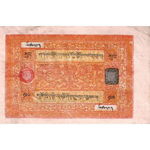 | Légende de l’avers | ༅།གནམ་བསྐོས་དགའ་ལྡན་ཕོ་བྲང་ཕྱོགས་ལས་རྣམ་རྒྱལ། ༡༠༠ སྲང་ ༅།ཆོས་སྲིད་གཉིས་ལྡན་གྱི་ཤོག་དངུལ་སྲང་བརྒྱ་ཐམ་པ། (Translation: The Tibetan government, by heaven appointed, is victorious in all directions, 100 Srang, The government is both spiritual and secular, the paper money`s value is One Hundred Srang) |