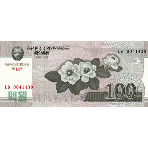 | Legenda do anverso | 조선민주주의인민공화국중앙은행 위대한 수령 김일성 동지 탄생 100 돐 주체 97 - 2008 백원 (Translation: Central Bank of Democratic People`s Republic of Korea Great Leader Comrade Kim Il Sung 100th Birthday Juche 97 - 2008 One Hundred Won) |