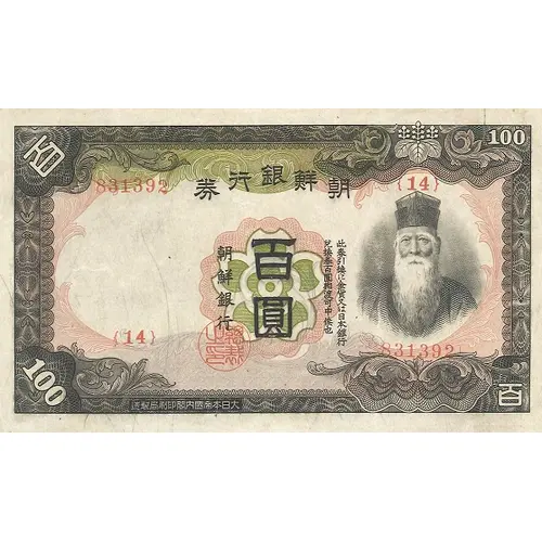 券行銀鮮朝 此券引換に金貨又は日本銀行况挟券百圓相波叮中候也 百圓 朝鮮銀行 |