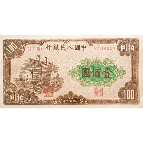 | Надписи оборотной стороны | 行銀民人國中 圓佰壹 1949 (Translation: People`s Bank of China 100 Yuan) |