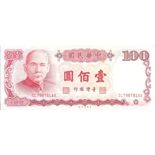 | Leyenda del anverso | 佰壹 (Yī Bǎi)國民華中(Zhōnghuá Mínguó) 100 圓佰壹(Yī Bǎi Yuán) 行銀灣臺(Táiwān yínháng) 厰製印央中 (Zhōngyāng yìnzhì chǎng) (Translation: One Hundred Republic of China 100 One Hundred Yuan Taiwan Bank Central Printing Factory) |
