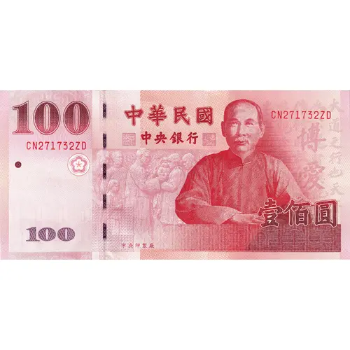 | Obverse lettering | 中華民國 中央銀行 壹佰圓 中央印製廠 (Translation: Republic of China Central Bank of the Republic of China 100 Yuan Central Printing Factory) |