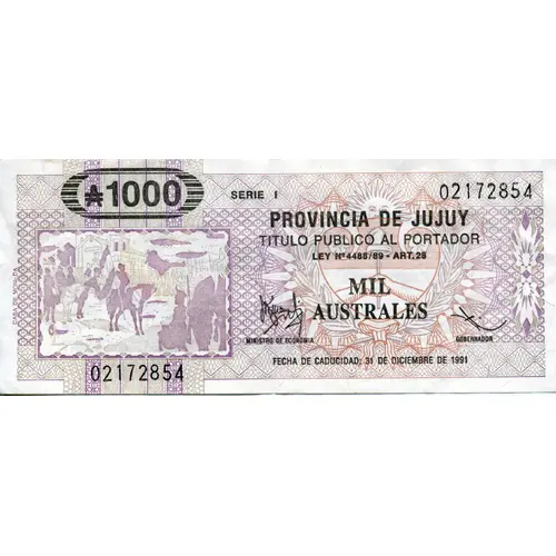 | Opis líce | A1000 PROVINCIA DE JUJUY TITULO PUBLICO AL PORTADOR LEY No 4488/89 - ART. 28 MIL AUSTRALES FECHA DE CADUCIDAD: 31 DE DICIEMBRE DE 1991 (Translation: Province of Jujuy Bearer public bond Law 4488/89 - Article 28 One thousand Australes Expiry date Dec. 31, 1991) |