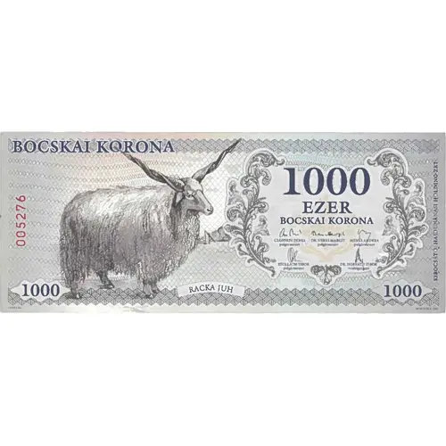 | Obverse lettering | 1000 EZER BOCSKAI KORONA RACKA JUH |