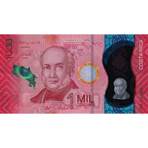 | نوشتههای روی اسکناس | 1000 ACUERDO № 5 20 de setiembre de 2019 SERIE C ESTADO DE COSTA RICA BRAULIO CARRILLO COLINA 1 MIL COLONES MIL COLONES COSTA RICA (Translation: Accord № 5 20 September 2019 Series C State of Costa Rica 1 Thousand Colones Thousand Colones Costa Rica) |