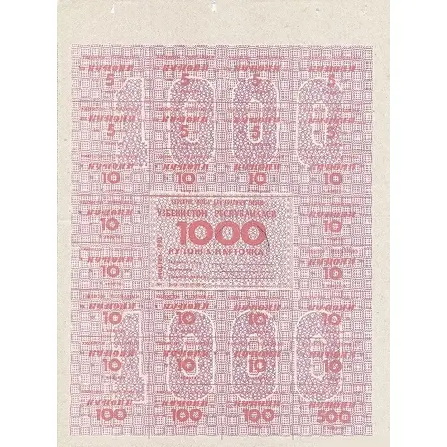 | Leyenda del anverso | БЕРИЛГАН ЖОЙГА ҚАЙТАРИЛИШИ ЛОЗИМ ЎЗБЕКИСТОН РЕСПУБЛИКАСИ 1000 КУПОНГА КАРТОЧКА Ташкилот номи __________ Фамилияси __________ Ташкилот раҳбари __________ Бош бухгалтери __________ М. Ў. 1 квартал 1993 г (Translation: The card of the Republic of Uzbekistan 1,000 coupons must be returned to the place of issue, Name of organisation/Last name/Head of the organization/Chief Accountant, 1st quarter year 1993) |