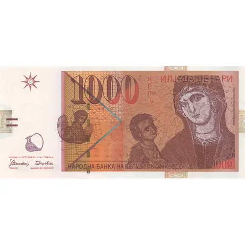| Ön yüz lejandı | НАРОДНА БАНКА НА РЕПУБЛИКА МАКЕДОНИЈА ИЛЈАДА ДЕНАРИ СКОПЈЕ, 8 СЕПТЕМВРИ 1996 ГОДИНА БОГОРОДИЦА ЕПИСКЕПСИС-ОХРИД-14 ВЕК (Translation: NATIONAL BANK OF THE REPUBLIC OF MACEDONIA ONE THOUSAND DENARI SKOPJE, 8th of SEPTEMBER 1996 THE VIRGIN MARY EPISKEPSYS, OHRID, 14th century) |