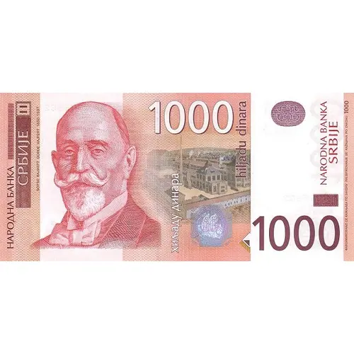 | Obverse lettering | НАРОДНА БАНКА СРБИЈЕ хиљаду динара hiljadu dinara 1000 ЂОРЂЕ ВАЈФЕРТ ĐORĐE VAJFERT 1850-1937 NARODNA BANKA SRBIJE ФАЛСИФИКОВАЊЕ СЕ КАЖЊАВА ПО ЗАКОНУ FALSIFIKOVANJE SE KAŽNJAVA PO ZAKONU (Translation: NATIONAL BANK OF SERBIA one thousand dinara one thousand dinara 1000 ĐORĐE VAJFERT 1850-1937 NATIONAL BANK OF SERBIA COUNTERFEITING IS PUNISHABLE BY LAW) |